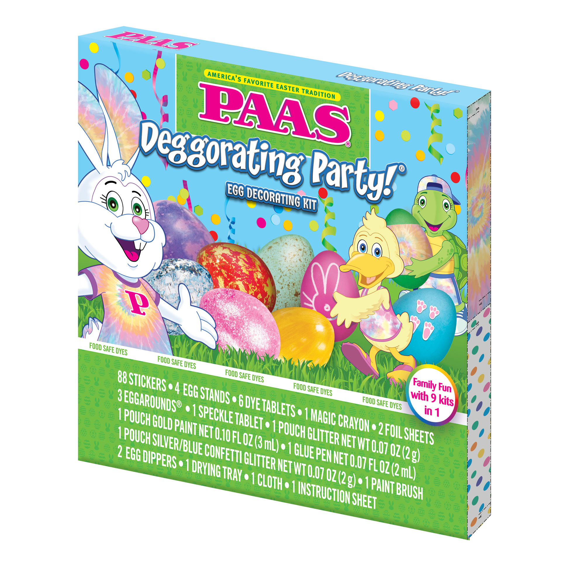 Invite the whole family over and then Hit the PAAS® Button. The PAAS® Deggorating Party! Kit has everything you need for a full-sized Easter egg decorating party. Use the dye tablets and egg dippers to easily dye the eggs vibrant colors. While the stickers, magic crayon, foil sheets, eggarounds®, paint brush, paint, and glitter can be used to add sparkly and colorful designs. This is the ultimate deggorating kit that will be fun for the whole family!