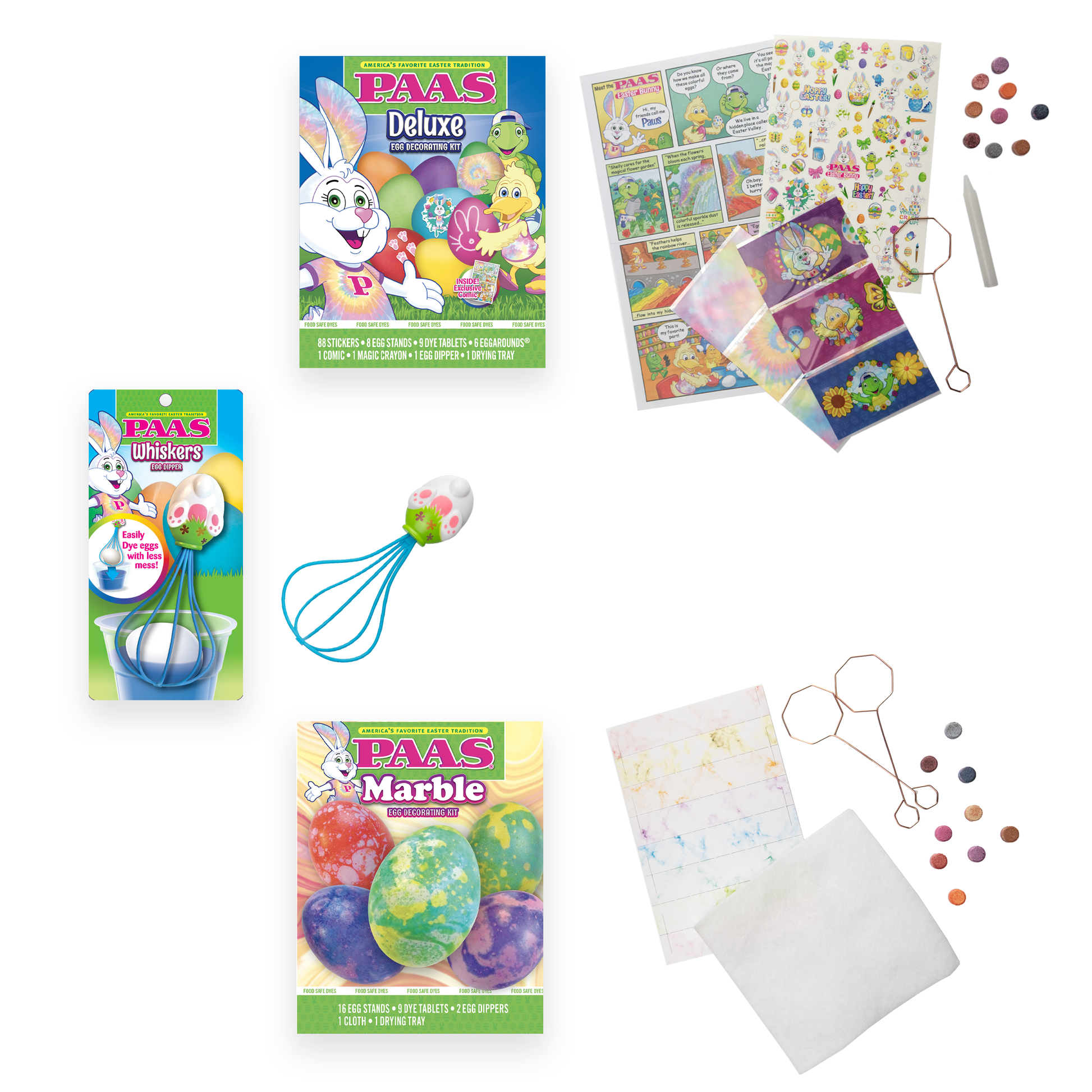 - Deluxe Egg Decorating Kit: Craft eggs in every imaginable shade with 9 different dye colors and a PAAS® Magic Crayon for intricate designs. Includes stickers, egg stands, and an exclusive PAAS® comic!