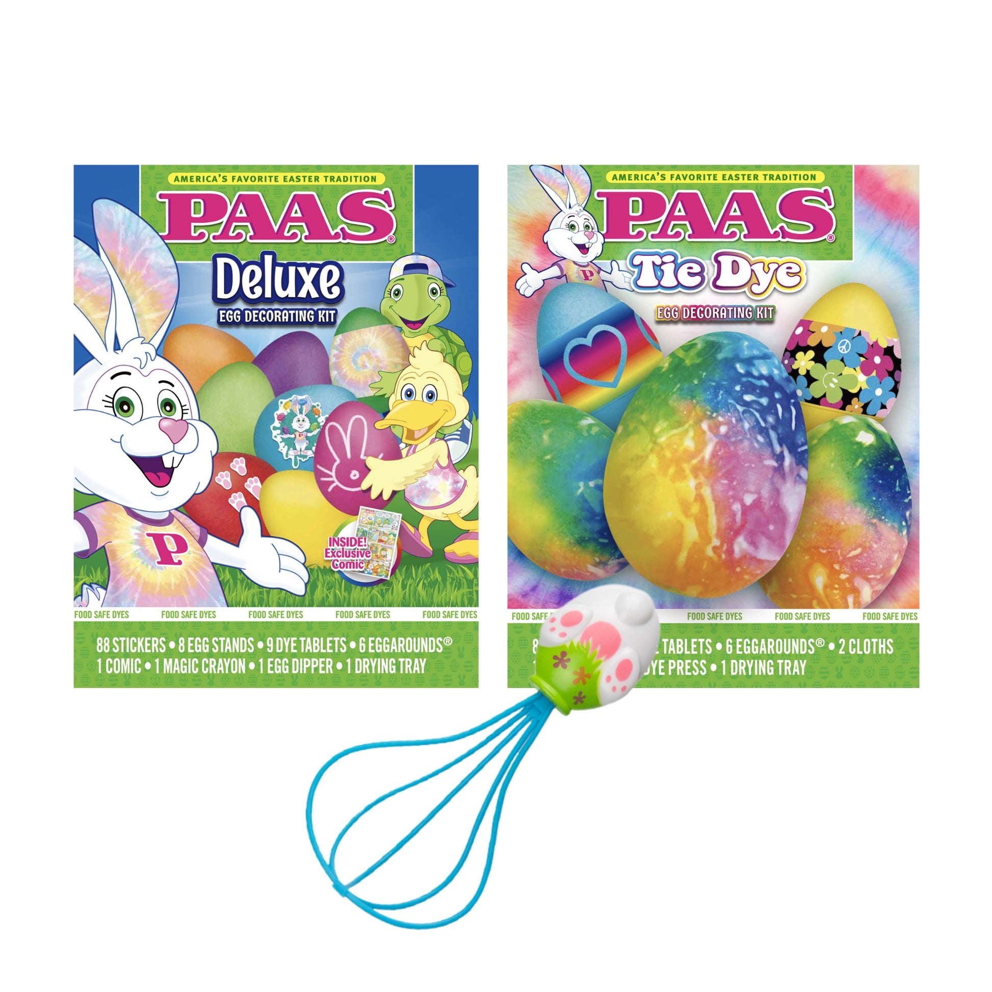 Bring fun, color, and creativity to your Easter celebration with this bundle that includes PAAS® Deluxe Egg Decorating Kit, Tie-Dye Egg Decorating Kit, and Whiskers Egg Decorating Tool! This bundle makes it easy to create beautifully dyed, uniquely designed eggs with a mix of classic colors and playful tie-dye effects—all while keeping the process mess-free.